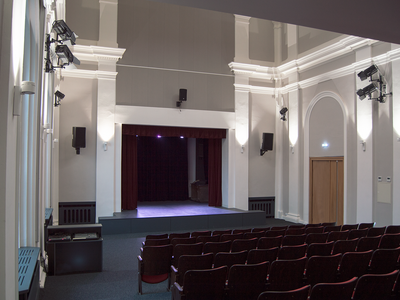 Aula Jiráskova gymnázia v Náchodě se po 50ti letech dočkala celkové rekonstrukce. Podle naší projektové dokumentace byla realizována citlivá obnova interiéru s výměnou oken, elektroinstalace včetně kvalitního prostorového a scénického osvětlení, ozvučení sálu, vzduchotechniky a s doplněním další soudobé jevištní techniky. Zvolené jemné teplé odstíny šedé výmalby a nezbytných akustických stěnových obkladů evokují dobové fotografie. Vše je doplněno antracitovými plochami podlah, mobiliáře, jeviště a barevným akcentem v podobě čalounění sedaček a opony.
